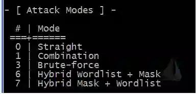 Straight(字典破解)Combination(组合破解)Brute-force(掩码暴力破解)Hybrid dict + mask(混合字典+掩码)Hybrid mask + dict(混合掩码+字典)