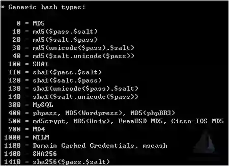 在HashCat–hash-type 参数可以指定要破解的HASH类型,运行hashcat主程序加上–help参数,在* Generic hash types:中可以看到各种HASH类型的代号,如图所示:
