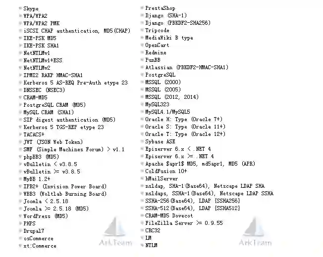 HashCat能够支持加密类型有200多种,且计算速度对于同等开源工具更高,主要的加密算法有下面这些: