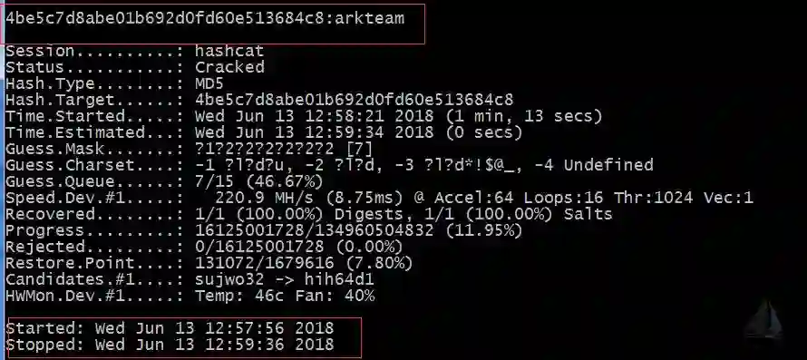 使用简单的字符进行md5加密,现在使用arkteam经过md5 hash之后变成4be5c7d8abe01b692d0fd60e513684c8。然后输入命令,使用HashCat破解。命令为: