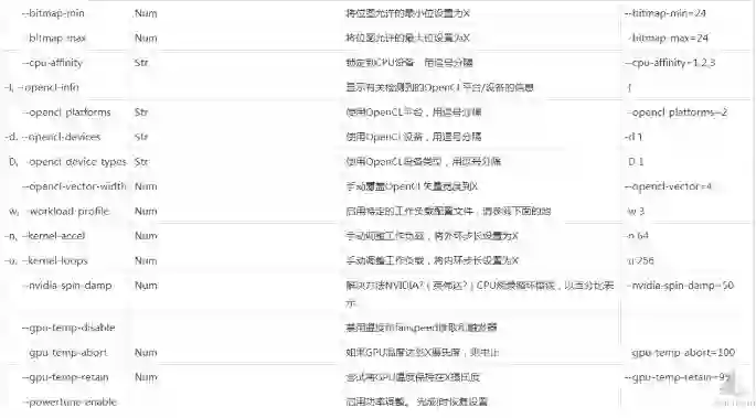 HashCat本身考虑到系统资源的分配,默认参数下并没有最大化的来使用硬件资源。如果我们想要让破解速度最大化,就需要对一些参数进行配置。下面是常用的一些参数说明: