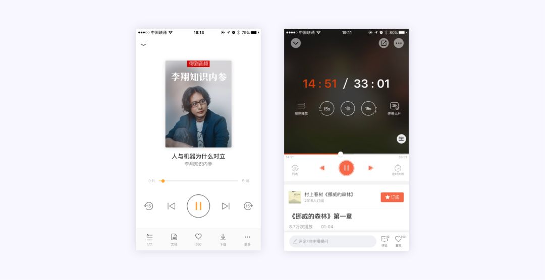 例如下图中分别是两个app,都是听书类应用,可以看到这两个界面,有个一样的功能—快进/快退 ,左边的快进快退功能分别放在上一篇下一篇的左右两边,这样比较容易的让用户理解;而右边的界面,就将这两个功能放在了封面上,在没有文字说明的情况,很难理解这三个icon分别是什么意思。