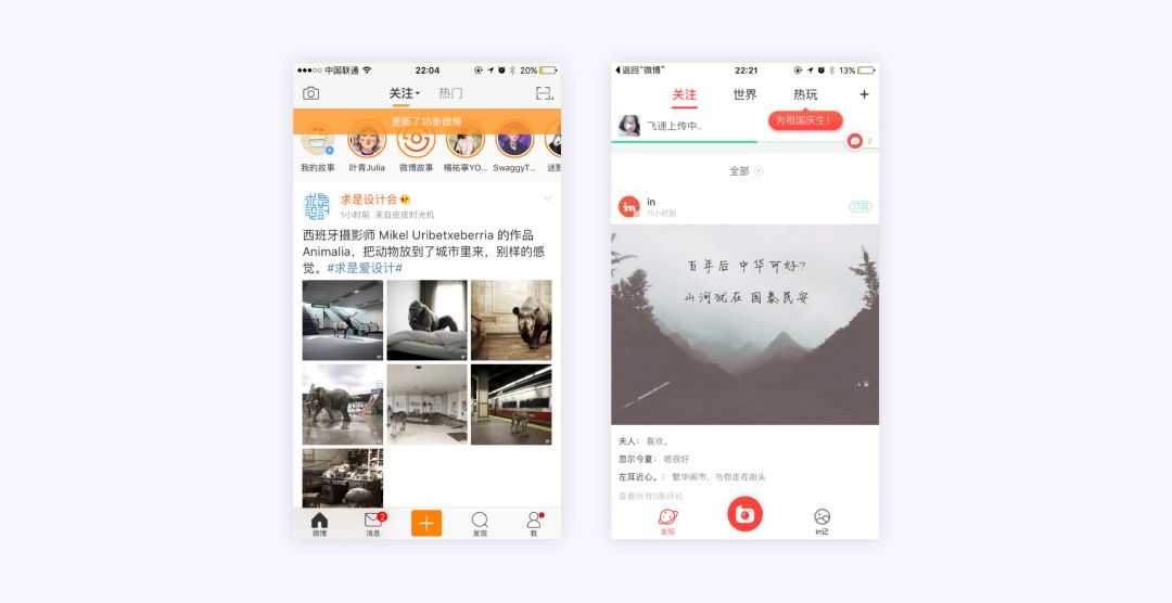微博的中断设计就是一个很好的例子,应用的新消息列表显示了最新的内容。只要用户还停留在这个页面,应用就不会自动更新列表,只会在顶部显示一个N条新消息 ,这可以使用户在被中断后重新使用时不丢失当前位置。右边in的这种小的气泡式的提醒也是使用了比较轻量的设计形式,不会打断用户的操作。