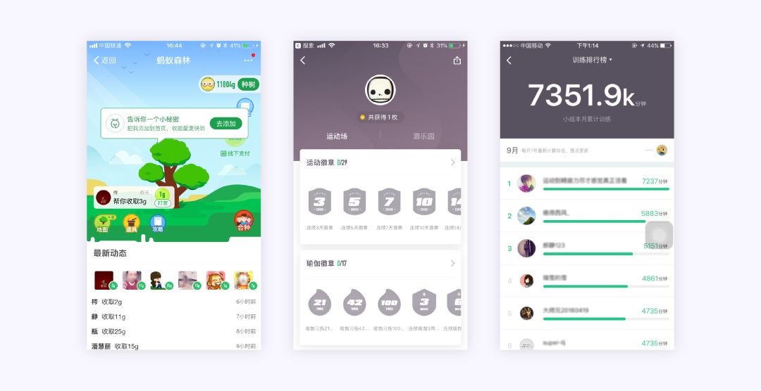 现在,市面上已经有很多产品融入了游戏化设计的元素。例如蚂蚁森林是通过游戏的方式倡导低碳生活,用在APP中种下一棵树对应现实中的一棵树,赋予用户一种使命感和荣誉感;且使用排名榜也能激发用户的竞争心态,从而提高参与度。
