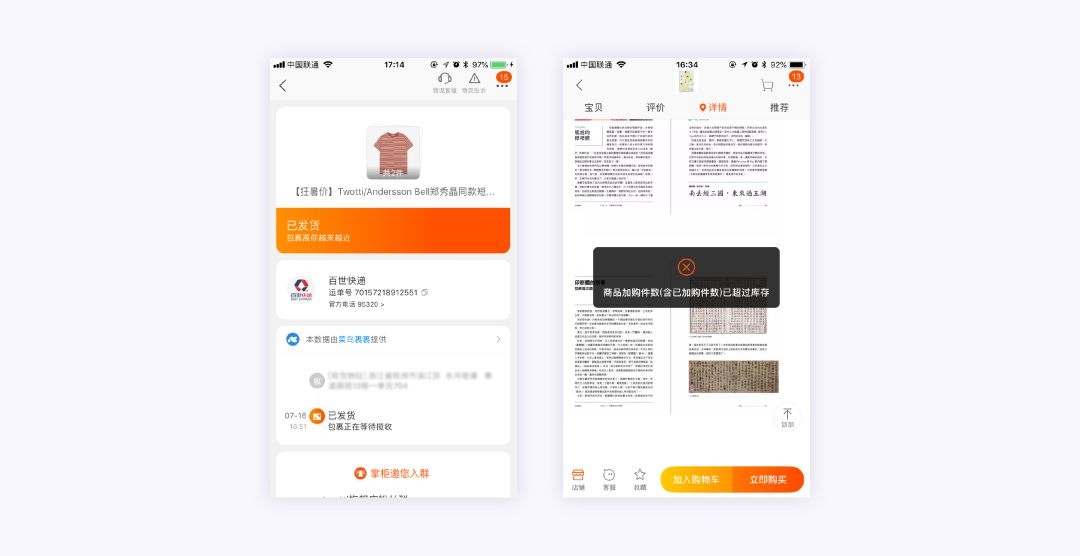 因此有价值的反馈一般指的是用户完成交互操作后有体验价值的反馈(如下图淘宝购物后的物流反馈)和效率价值的反馈(如下图操作有误的toast提示)。