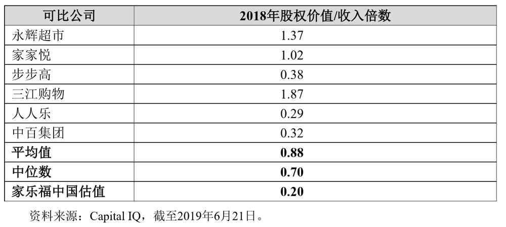 在公告中,为了说明家乐福中国的资产价值,苏宁国际为国内主要零售巨头的价值做了一张表格,根据2018年股权价值/收入倍数,永辉超市以1.37位列可比公司第一位,而家乐福中国估值仅有0.20。其他进入列表的公司包括家家悦等,同时这张列表并未列入中国线下超市两家龙头公司:华润万家和大润发。