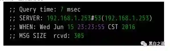 上面结果显示,本机的DNS服务器是192.168.1.253,查询端口是53(DNS服务器的默认端口),以及回应长度是305字节。