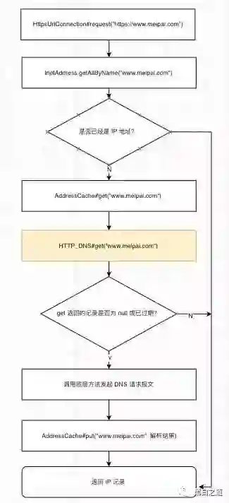 这个偷天换日的操作之后,HttpsUrlConnection 等 Java 层网络请求在进行 DNS 解析时就会是这样一个流程: