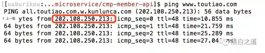 可以在终端命令窗口ping 今日头条官网域名,就可以看到该域名对应的IP地址了。