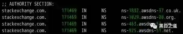 上面结果显示stackexchange.com共有四条NS记录,即四个域名服务器,向其中任一台查询就能知道stackexchange.com的IP地址是什么。