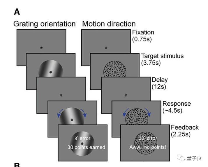 在每次测试中,参与者们首先会看到一个图像,接着用12秒来回忆所见信息,然后根据记忆判断刚才的光栅倾斜方向或一团点的移动方向。
