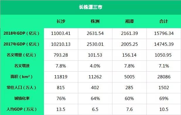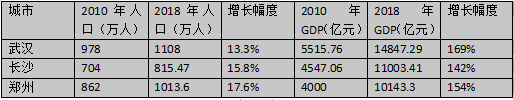 截至2018年,三个城市GDP都过千万,武汉、郑州的人口也都突破千万,唯一例外是长沙以刚过八百万的人口,实现了11000亿的GDP。