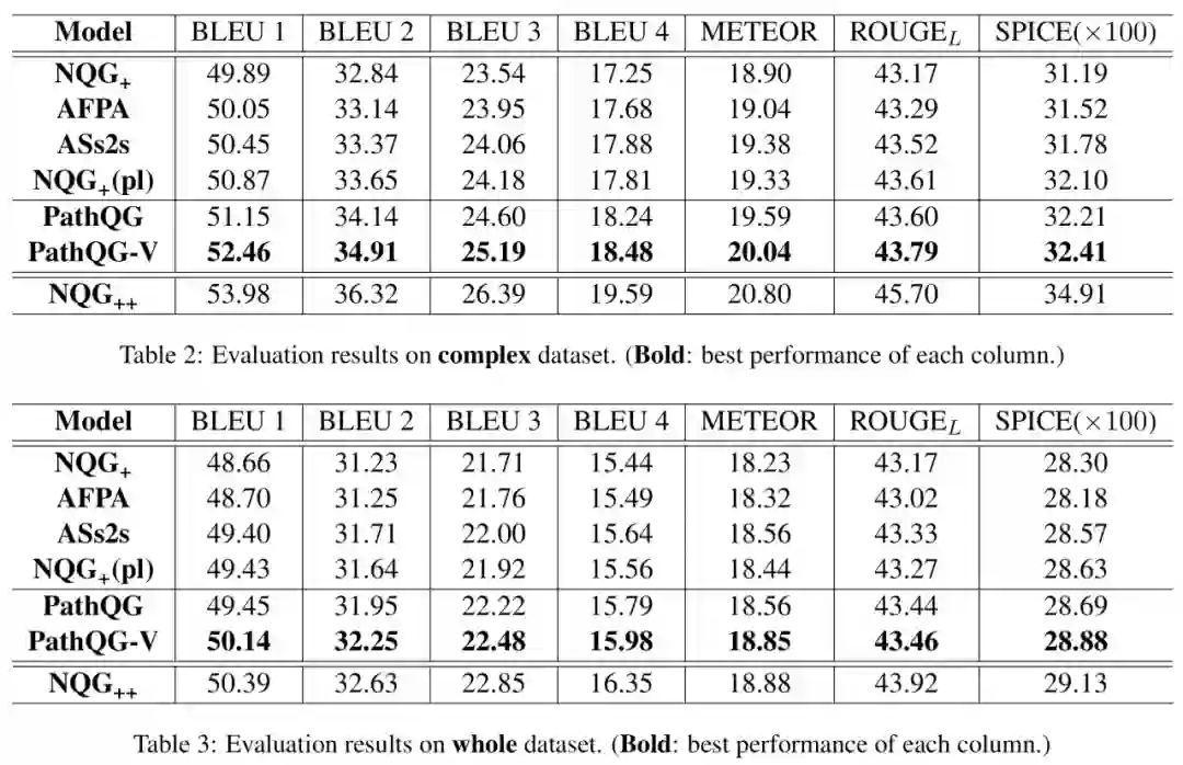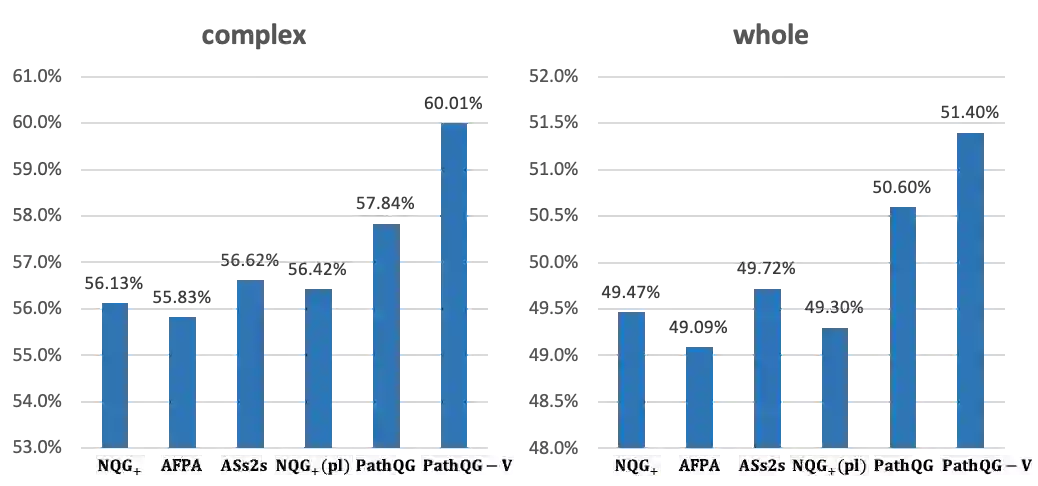 我们在SQuAD数据集上进行了实验,对每一条文本,通过场景图解析器(scene garph parser)和词性标注器(part-of-speech tagger)自动构建了知识图谱,并且根据参考问题从知识图谱中抽取出对应的query path。为了进一步验证模型在复杂问题生成上的效果,我们还根据query path中事实三元组的个数从SQuAD中划分了一个复杂问题数据集。在全数据集和复杂数据集上的实验结果显示我们的模型都优于其他模型。