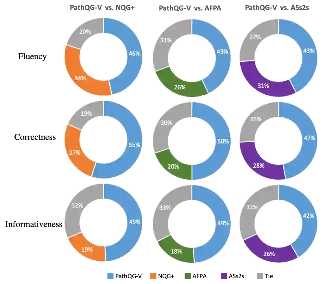 除了自动评估,我们还通过Amazon Mechanical Turk (AMT)进行了人工评估,分别从问题的流利度、正确性(和给定文本和答案一致)、信息量对不同模型生成的问题进行了两两比较,结果显示我们的模型也取得不错效果。