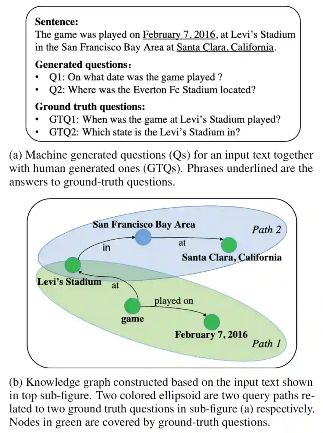 先对输入文本中的事实(facts)进行建模可以减轻这些问题,并且针对文本中的多个事实,可以生成较为复杂(complex)的问题。我们通过对给定文本构建知识图谱(Knowledge Graph,KG)来表示其中的事实,并提出一个新任务:给定知识图谱中的一条query path来生成问题,其中query path是一条由多个事实三元组构成的序列,每个事实三元组包含两个实体以及它们的关系。如上图(b)显示了一个KG以及其中的两条query paths。