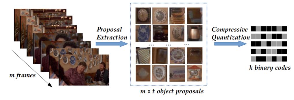 给定一个m帧的视频,我们从每一帧里提取t个候选物体,利用所提的压缩量化方法将这m x t个候选物体压缩成k个二进制编码描述。从而实现更快速有效的物体搜索