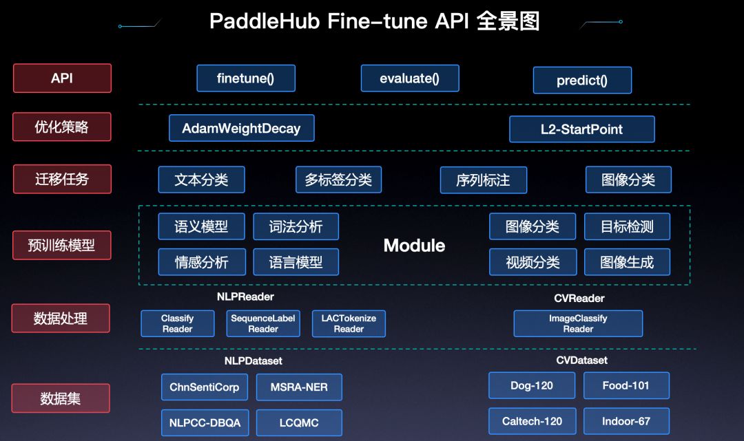 PaddleHub封装了finetune、eval、finetune_and_eval、predict等直观的基础接口,让开发者更方便完成模型的迁移和应用。