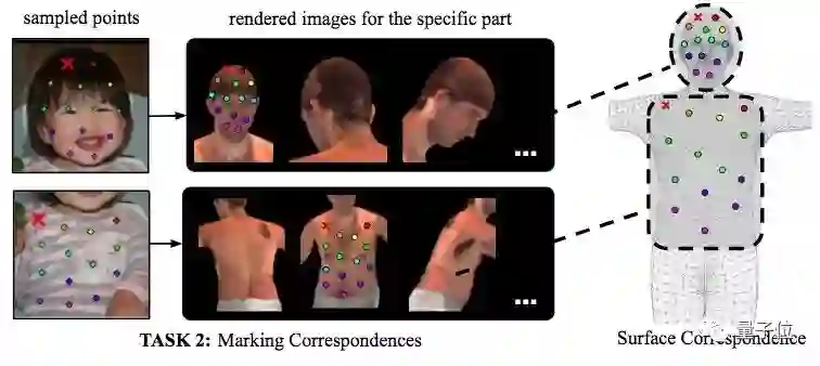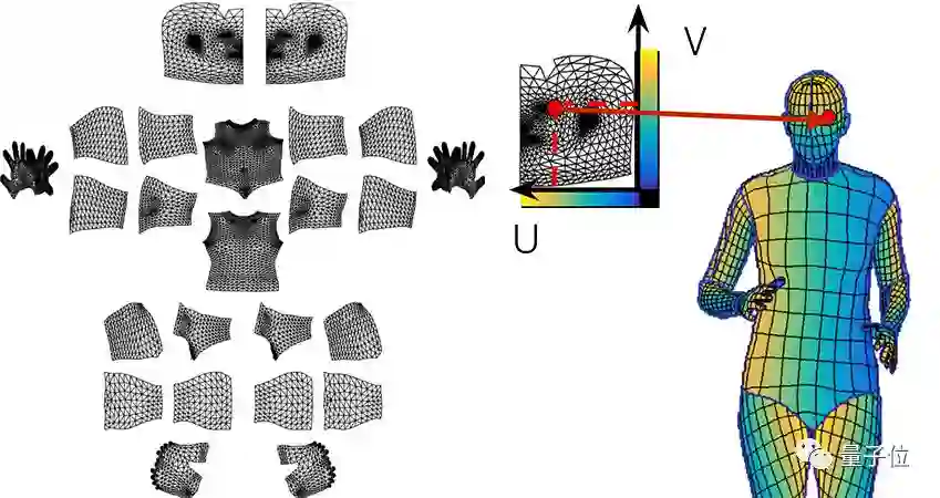 然后,研究团队用一组大致等距的点对每个身体部位区域进行采样,并把这些等距点与相应的身体部分的预渲染的展开面的点对应起来(取6个视角的平面图像,为3D展开图提供参考)。