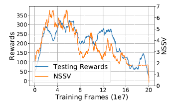 其中 σ_j (H) 代表特征矩阵 H 的第 j 大奇异值。观察了 NSSV 与 Reward 之间的关系后,发现 NSSV 的值与 Reward 的趋势一致(如图5)。