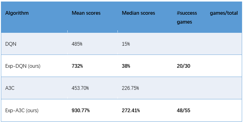 我们在 Atari game 上验证了所提出算法的有效性。表1给出了算法 Exp-DQN 和 Exp-A3C 在 Atari game 上的表现。平均来看,它们可以取得更高的分数,并且 Exp-DQN 在20个(共30)游戏中打败了 DQN,Exp-A3C 在48个(共55)游戏中打败了 A3C。图6给出了训练过程中 A3C 和 Exp-A3C 算法的 NSSV 和 Reward 曲线。可以看出 Exp-A3C 有效地增大了 NSSV,并且提升了算法在 Atari game 上的表现。以上实验结果验证了 Exp-DRL 这类算法的有效性。