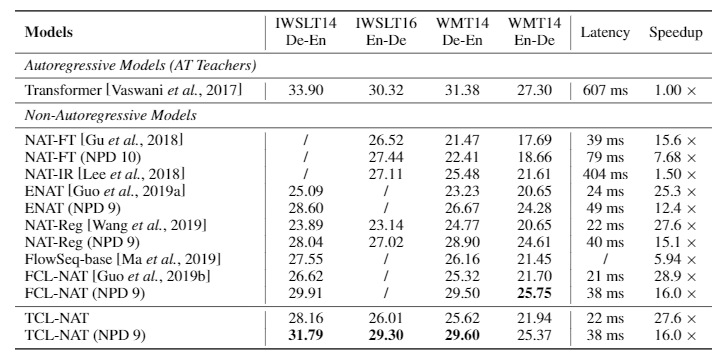 表3:TCL-NAT 同基线模型的 BLEU 分数比较。标注 NPD 9 表示采用有9个候选者的 Noisy Parallel Decoding(NPD),未标注的表示只有一个候选者。
