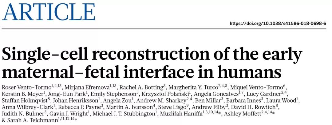 在这项研究中,研究人员描述了人类妊娠早期(6-14周)胎盘的约7万个细胞的转录组以及与之匹配的母血和蜕膜细胞,研究了胎盘-蜕膜界面处的胎儿细胞和母体细胞之间的“交流”,并利用所得数据开发了一种新型统计工具(CellPhone, www.CellPhoneDB.org/),用以预测潜在的特殊的细胞间互作。