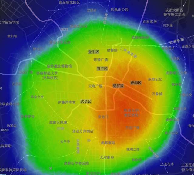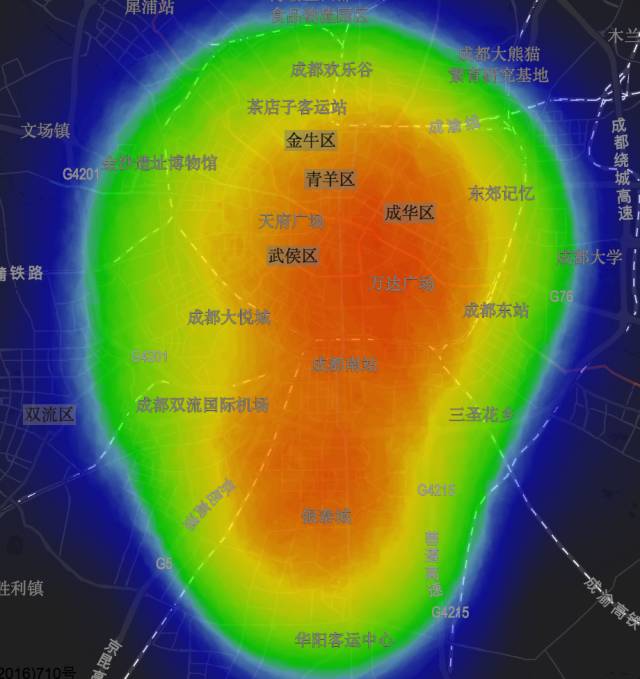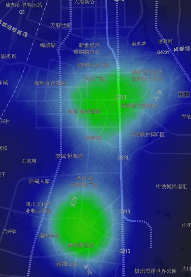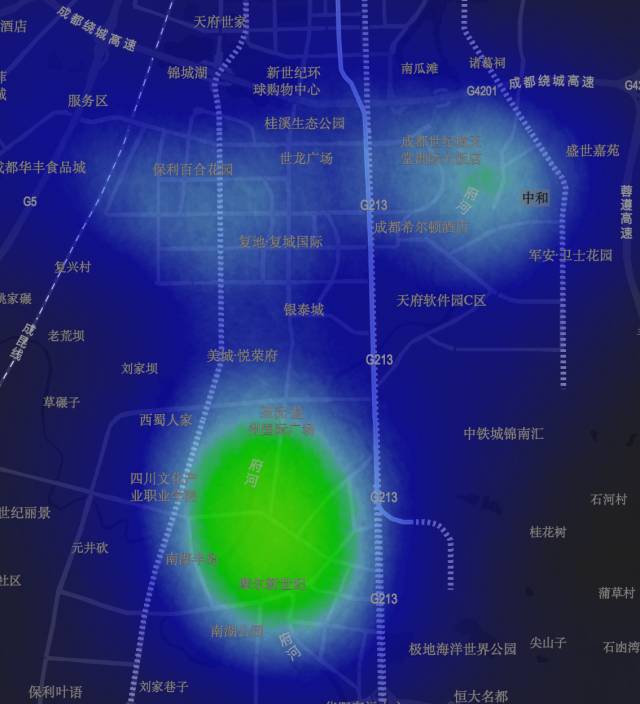 从摩拜单车的热图分布来看,成都已经逐步呈现“双核”发展的态势,城市的新中心天府新区正在聚集更多的人和机会。