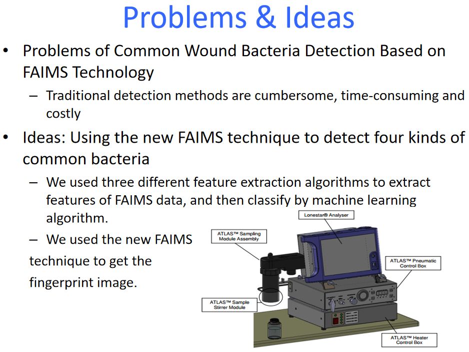 在临床实践中,医生普遍关注的问题是各种类型的伤口感染容易导致病人死亡、致残和经济负担。快速、可靠地检测出感染性细菌是后续治疗的关键,也成为当今研究热点之一。本文利用高场不对称离子迁移谱检测技术(FAIMS),对金黄色葡萄球菌等四种常见的伤口感染细菌进行区分。并对不同特征提取方法与学习器在伤口感染细菌分类问题上的性能,进行了比较分析。