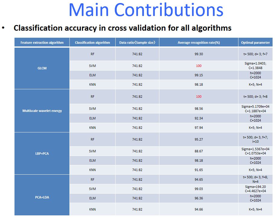 采用灰度共生矩阵(GLCM)、基于主成分分析的局部二进制模型(PLBP)和多尺度小波能量(MSWE)三种特征提取算法进行特征提取;采用随机森林(RF)、K最近邻(KNN)、极限学习机(ELM)和支持向量机(SVM)进行细菌样本的分类。实验结果表明,GLCM和多尺度小波能量的特征提取方法能够较好的提取出区分不同细菌样本的特征。随机森林和支持向量机均表现出了较高的识别性能。其中,以多尺度小波能量(MSWE)进行特征提取,以随机森林算法作为分类模型的组合方法达到了100%的识别率;以灰度共生矩阵(GLCM)进行特征提取,以支持向量机(SVM)作为分类模型的组合方法也达到了100%的识别率本。