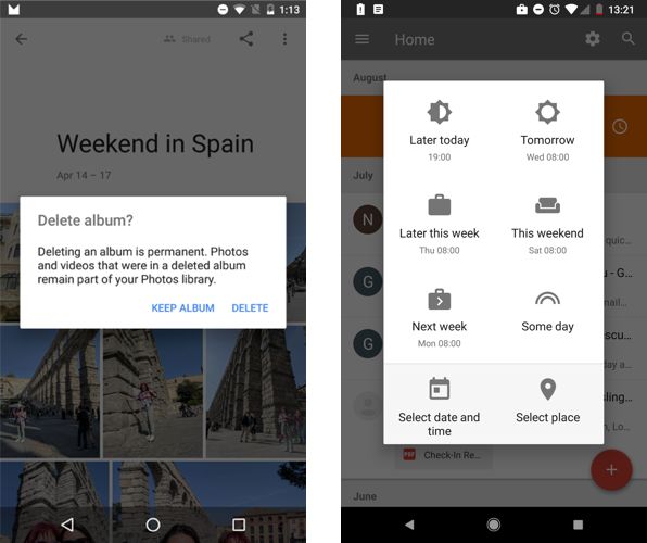 比如说,Google Photos 添加了确认对话框,避免用户不小心删除相册。而收件箱的闹钟功能(让邮件打个盹儿),则可以一键设定在某段时间后让邮件重新出现在眼前。
