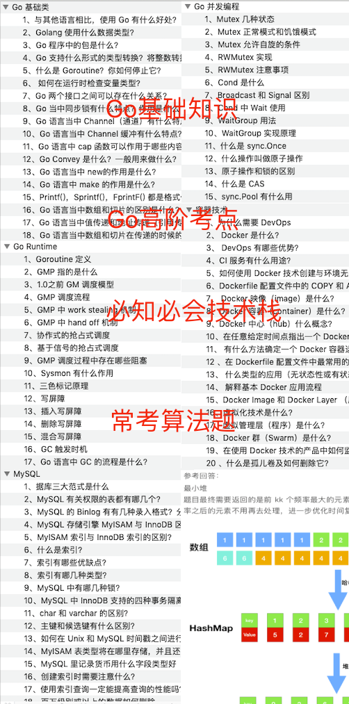 Go作为一门相对年轻的语言,很多面试和学习资料也是东一榔头西一棒子,啃起来耗时费力。下面这些资料比较有条理,大家可以按图索骥,效率会更高一些。