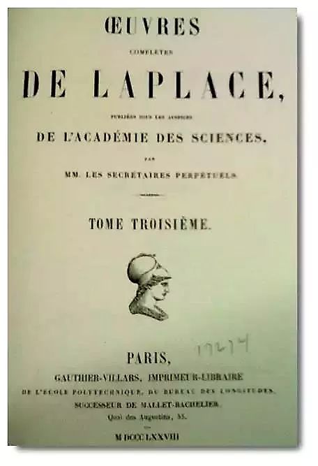 ►Pierre-Simon de Laplace天体力学鸿篇巨著 Mécanique céleste 1828年版封面,他也是第一位利用完整的数学公式建立行星形成理论的伟大科学家。图片来源:耶鲁大学教授Gregory Laughlin拍摄于UCSC Science Library.