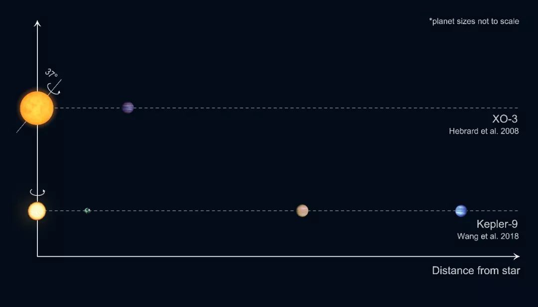 ►图4. 热木星(如XO-3)的行星公转轨道和主星自转轨道并不是总一致。然而,多行星系统(如Kepler-9)的行星公转轨道和主星自转轨道基本一致。这让我们不禁怀疑,热木星可能经历过一些比较激烈的迁移过程。图片来源:科学像素。