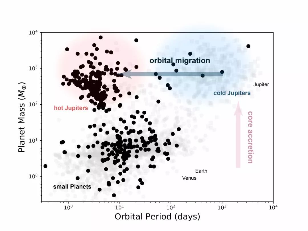 ►图2. 太阳系外行星分布图。从图中可以看出,太阳系外行星大体可以分为三类:一类是质量较小的small planets;一类是质量较大,距离其主星较远的冷木星cold Jupiters,我们太阳系的木星就属于这一类;还有一类就是本文主人公,质量较大,且离主星较近的热木星。现有的热木星形成理论,通常由两部分组成,一部分是核吸积过程,这个过程早年间争议很大,但现在已经被广泛认可。另一部分是轨道迁移,这个过程充满争议。我们还不清楚这个迁移过程到底是一个激烈的过程,还是一个平静的过程。图片来源:科学像素。