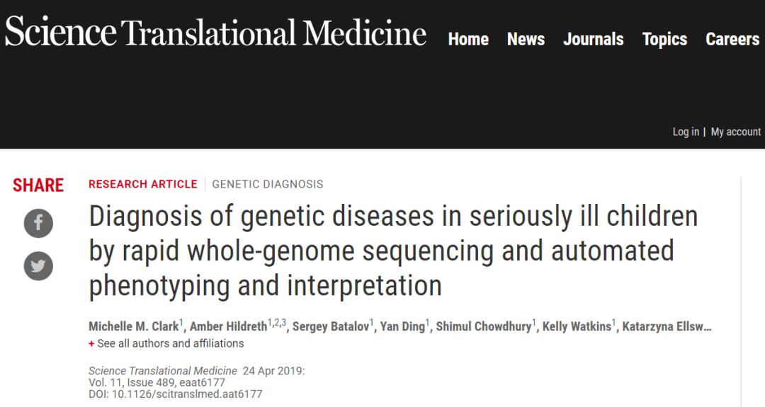 美国拉迪儿童基因组医学研究所(RCIGM)的工作人员素来以工作迅速闻名,2018年2月份,该研究所以平均用时19小时的全基因组测序快速诊断技术,打破了吉尼斯世界纪录。随后,该研究所建立了一套自动化分析流程,用于分析来自电子病历的数据和干血斑的基因组序列,为疑似遗传病重症儿童提供潜在的诊断方案。该工作系统可在24小时内提供检查结果,极大地减少了用户干预,提高了可用性,并且诊断时间更短。近日,该研究成果发表在Science Translational Medicine上,文章题为“Diagnosis of genetic diseases in seriously ill children by rapid whole-genome sequencing and automated phenotyping and interpretation”。