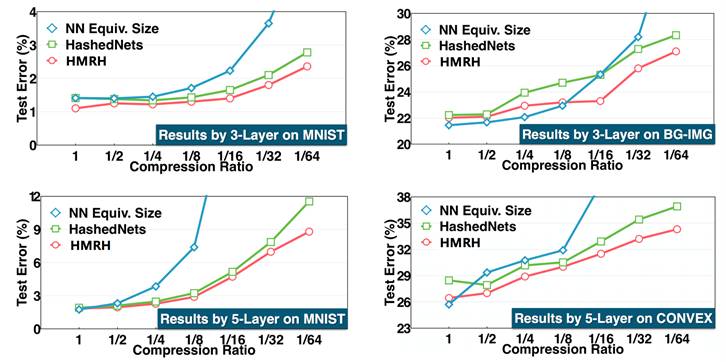更进一步地,我们将多种子随机哈希压缩算法推广至其他神经网络层,如卷积层、全连通层。但是这样会带来一个问题,不同层的压缩率如何设置。为了解决这个问题,我们提出同源压缩算法,如图 5 所示,即深度神经网络的所有层公用一个压缩空间,而不同层拥有各自的轻量重构神经网络。这种方式不仅方便设置统一的压缩率,而且诸多实验表明具有更好的压缩效果。图 6 是固定网络大小时不同压缩率下的错误率情况,可以看出,在不同数据集、不同深度的模型以及同一压缩率下,相对于单种子随机哈希压缩算法(HashedNets),同源多种子随机哈希压缩算法(HMRH)具有更低的错误率。
