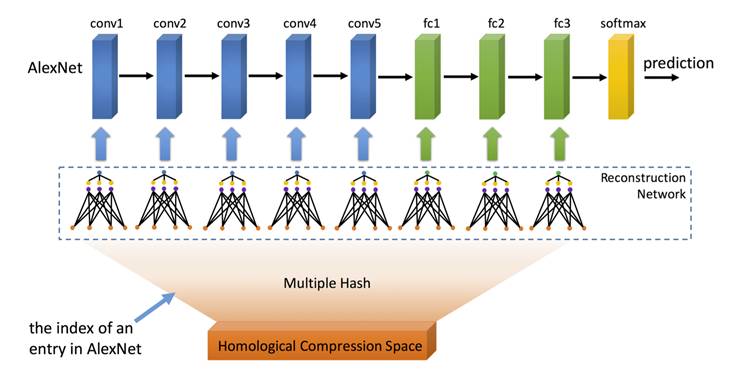 到目前为止,多层次乘积量化能够实现 1/8 无损压缩。有没有压缩率更大的压缩算法能够支持超大规模 DNN 模型?多种子随机哈希正是这样一种压缩算法:在无损或者可接受的有损范围内,它能够任意配置压缩率,适用于不同应用场景。图 4 是它的示意图: