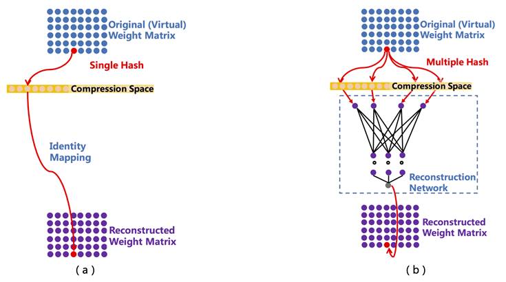 图 4-a)是 Wenlin Chen 在 ICML 2015 发表的「Compressing neural networks with the hashing trick」,它的主要思想是通过单种子的随机哈希函数将原始空间和压缩空间连接起来,并通过设定压缩空间大小来达到配置任意压缩率的目的。但是,在这种方法中压缩率和冲突率成正比(这里的冲突是指原始 embedding 空间不同位置的点落入压缩空间的同一个位置上),而冲突率过大则会使效果有损。图 4-b)是为了降低冲突率而提出的多种子随机哈希压缩算法,它的流程如下:对于一个要解压的参数,首先根据它的位置获得多个随机哈希值,映射至用户配置的压缩空间,并取出相应的哈希值作为轻量级重构神经网络(图 4-b 虚线框内)的输入,该网络的输出则是重构之后的参数值。相对于单种子随机哈希压缩算法,多种子随机哈希压缩算法具有更低的冲突率,并在多个任务中在效果无损情况下取得更高的压缩率。