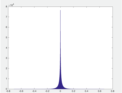 对于 NLP 任务,目前已有的深度神经网络模型中动辄应用百万量级词典,其中 embedding 层的参数占整个模型的绝大部分,所以解决模型内存消耗首先从 embedding 层入手。图 1 是用于相关性排序系统中卷积神经网络模型的 embedding layer 参数的值域分布图: