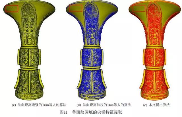 实际三维激光扫描获得的青铜器模型,分别采用本文算法和Tran等人[1]提出的算法进行了纹饰特征提取,包括采用两种算法进行了纹饰特征增强前后纹饰特征提取实验。