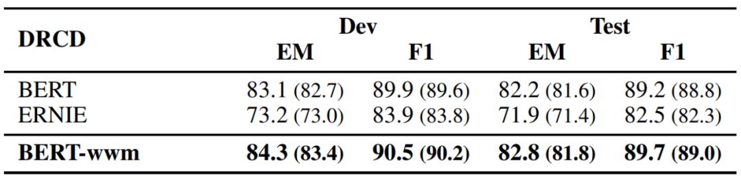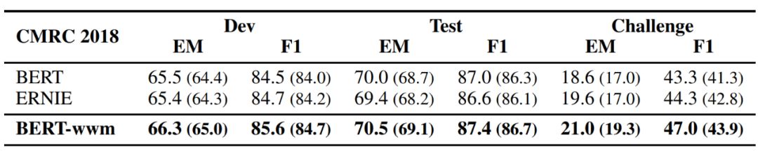 表 3:三个模型在 CMRC 2018 数据集上的表现。最好的学习率分别为:BERT (3e-5)、 BERT-wwm (3e-5)、ERNIE (8e-5)。