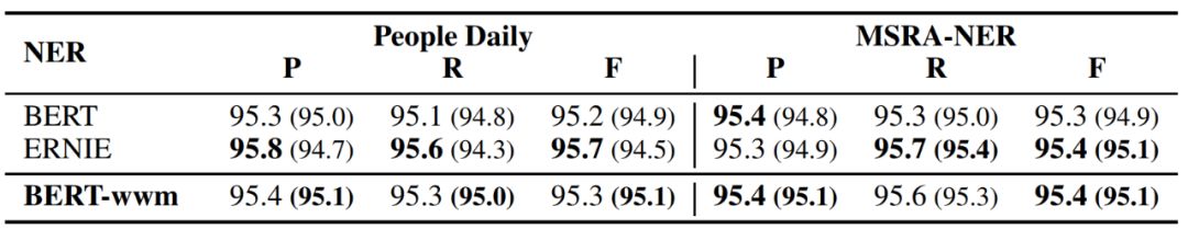 表 6:在人民日报数据集(People Daily)和微软研究院 NER 数据集(NSRA-NER)上的表现。人民日报数据集上最好的模型学习率是:BERT (3e-5)、 BERT-wwm (3e-5)、 ERNIE (5e-5)。在微软亚洲研究院数据集上最好的模型学习率是:BERT (3e-5)、 BERT-wwm (4e-5)、 ERNIE (5e-5)。