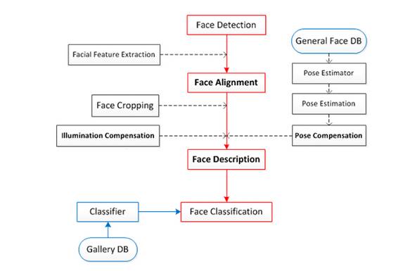 face detection -> face alignment -> face verification -> face identification