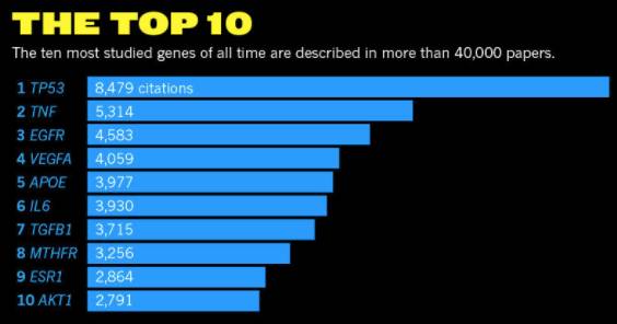 基因组学研究一直都是生物学研究中绕不开的话题,而人类的基因更是如此。那么你是否知道哪些人类基因最受关注呢?近日,Nature News报道称,来自哈佛大学的Peter Kerpedjiev博士通过整理分析美国国家医学图书馆的PubMed数据库中收录的研究论文,挑出了50来最受研究人员关注的10个基因,包括了TP53、TNF、EGFR、VEGFA、APOE、IL6、TGFB1、MTHFR、ESR1和AKT1。它们有的与细胞数目增加、功能分化相关;有的与癌症、炎症、老年痴呆症等疾病相关;有的与血管发育、免疫应答、信号通路响应等过程相关。他指出,生物学问题、社会压力、商业机会以及医疗需求等因素共同促成了人们对某些基因的关注。
