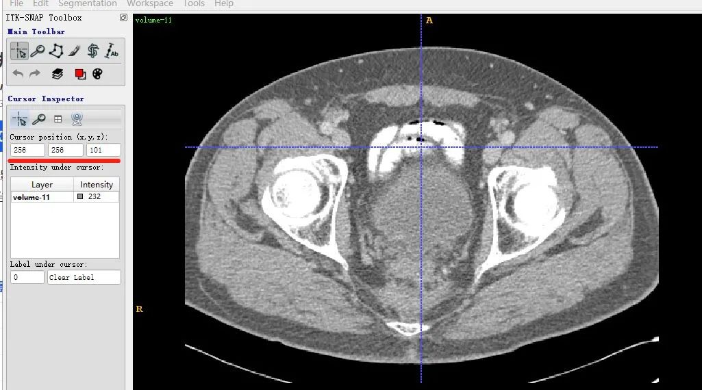 同一个slice在ITK-SNAP可视化结果(注意这里(x,y,z=(256,256,101)),因为itk-snap默认从1开始索引):