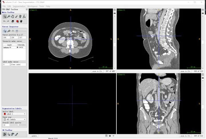 首先介绍一下医学图像可视化软件ITK-SNAP, 可以作为直观感受医学图像3D结构的工具,也可以用来做为分割和检测框标注工具,免费,很好用,安利一下:ITK-SNAP官方下载地址:http://www.itksnap.org/pmwiki/pmwiki.php。此外,mango(http://ric.uthscsa.edu/mango/)是另一个非常轻量的可视化软件,也可以试试。我一般用ITK-SNAP。