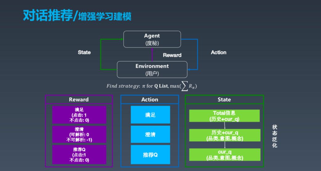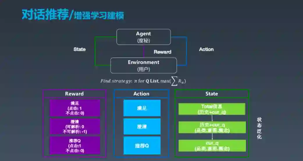 这是序列决策的建模的过程,我们用增强学习的框架来建模。这个大的框架中有 Agent 和 Environment,其中 Agent 是度秘,Environment 是用户,用户会发出信号,度秘结合各种因素得出状态,采取行动,最后整体环境会给出 Reward。这个过程看起来清晰简单,但是在工业界真正实现并做好非常不易。