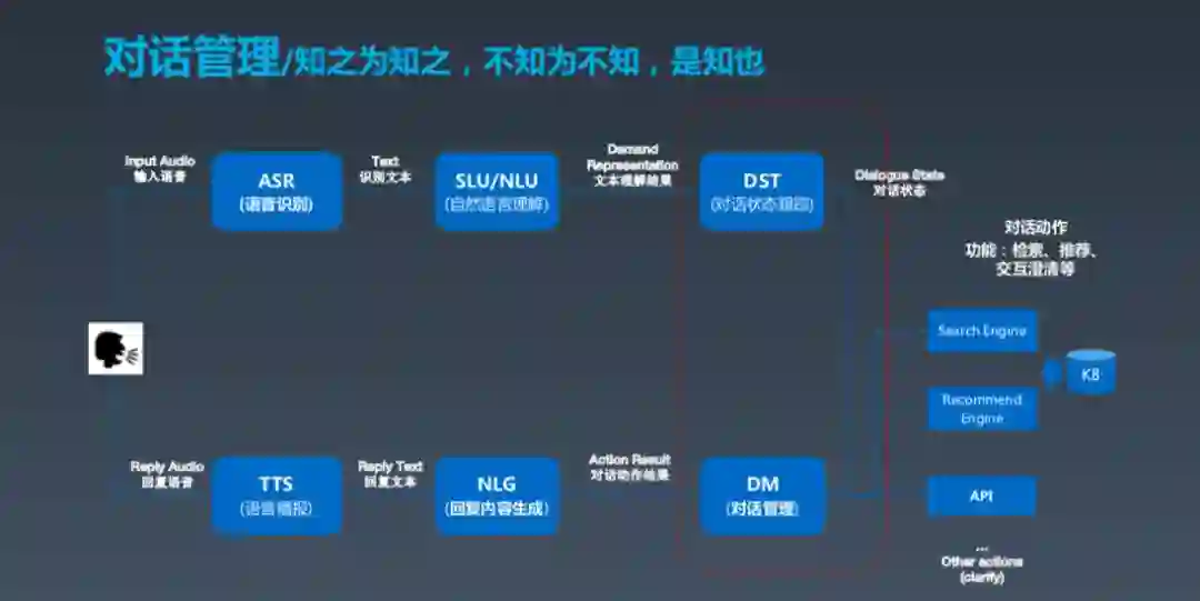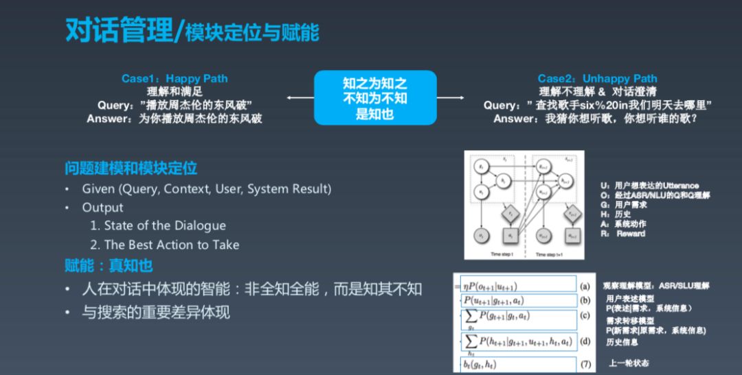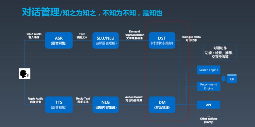 NLU 之后还有一个很重要的对话管理部分,从抽象逻辑上来看就是理解之后,做动作之前还需要做一些事。第一,了解系统的状态;第二,根据现在的状态选择最好的动作。所以,对话管理下的副标题叫“知之为知之,不知为不知,是知也”,意思就是你知道就知道,不知道别瞎说。这很重要,对话智能需要真正做到这一点,不要不懂装懂。