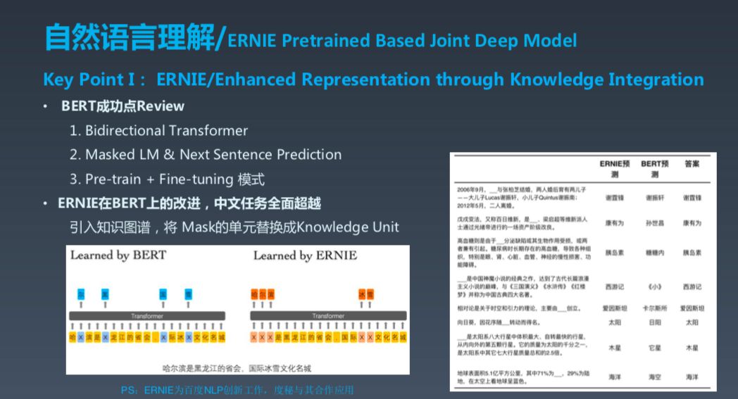 接下来是我理解的 BERT 成功的几个关键点。第一个关键点是双向 Transfomer,之前的建模都是从左到右或从右到左进行预测,而 BERT 是双向的;第二是它可以进行 Next Sentence Prediction;第三是它的大框架很好,Pre-train+Fine-tuning 的模式不新鲜,但它的设计很巧妙,基本上能够刷爆各种任务。ERNIE 在 BERT 上进行改进之后,在中文任务上基本上是全面超越,核心点是我们之引入了知识图谱。