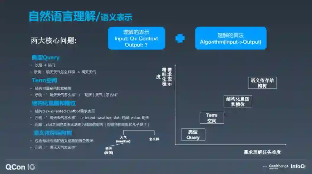 以我的理解,语义表示可以分为这几类,第一种是用文本表示,我们叫做典型 Querry;第二种语义理解是 Term 空间;第三种是结构化意图和槽位,这是学术流派流行的术语,它分为两部分,第一部分是意图(intent),第二部分是槽位(slot),即更加详细地描述需求的信号,但实际它有一个问题,即 slot 的关系很难精细刻划,比如问“刘德华的哥哥的儿子是谁”,由于 slot 是个平行结构,无法表示这种复杂的关系。所以,句法解析流派也有用基于语义异存结构数来进行语义表示。